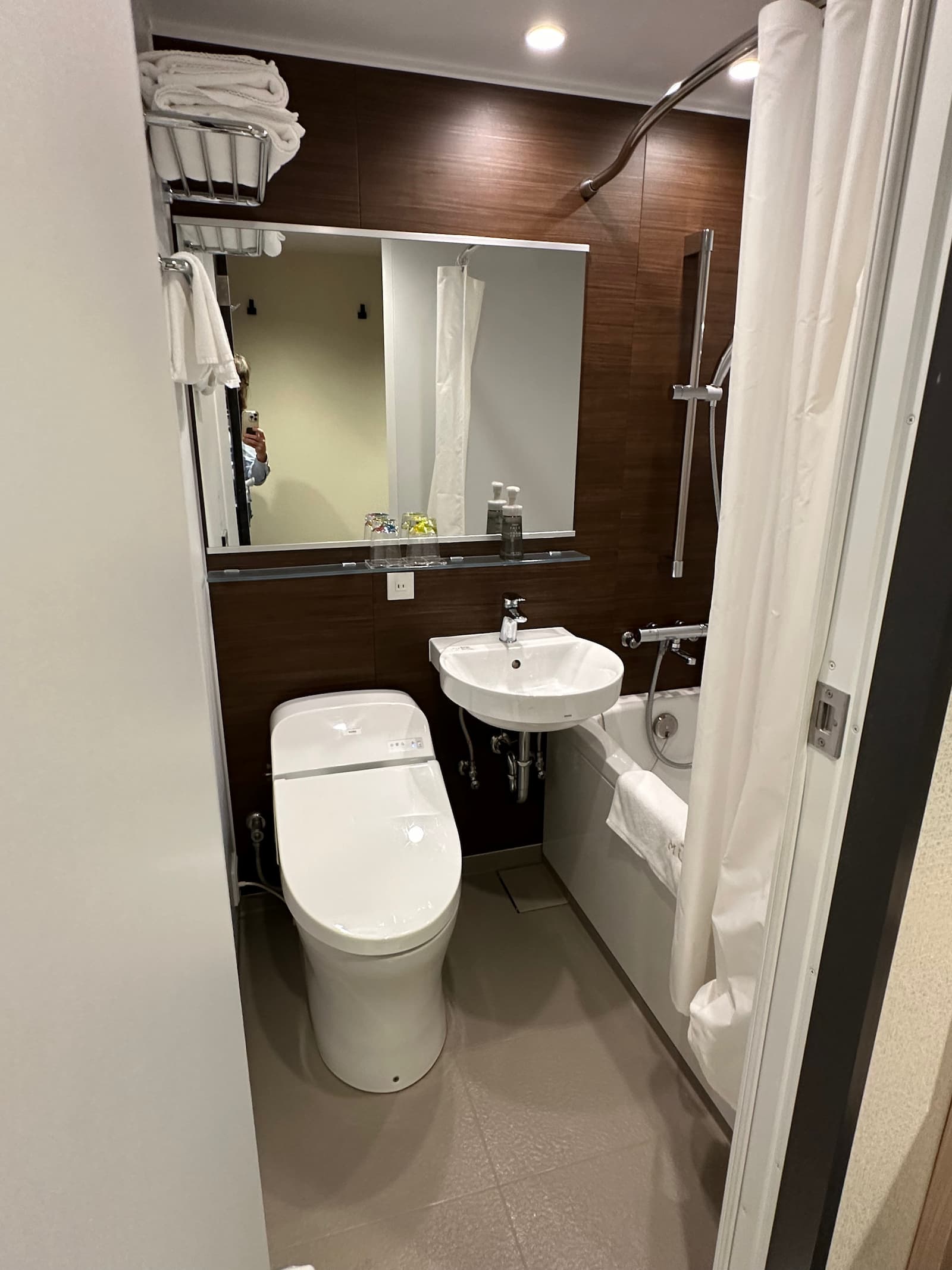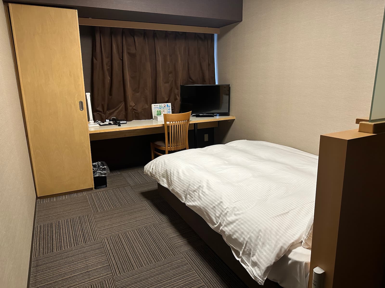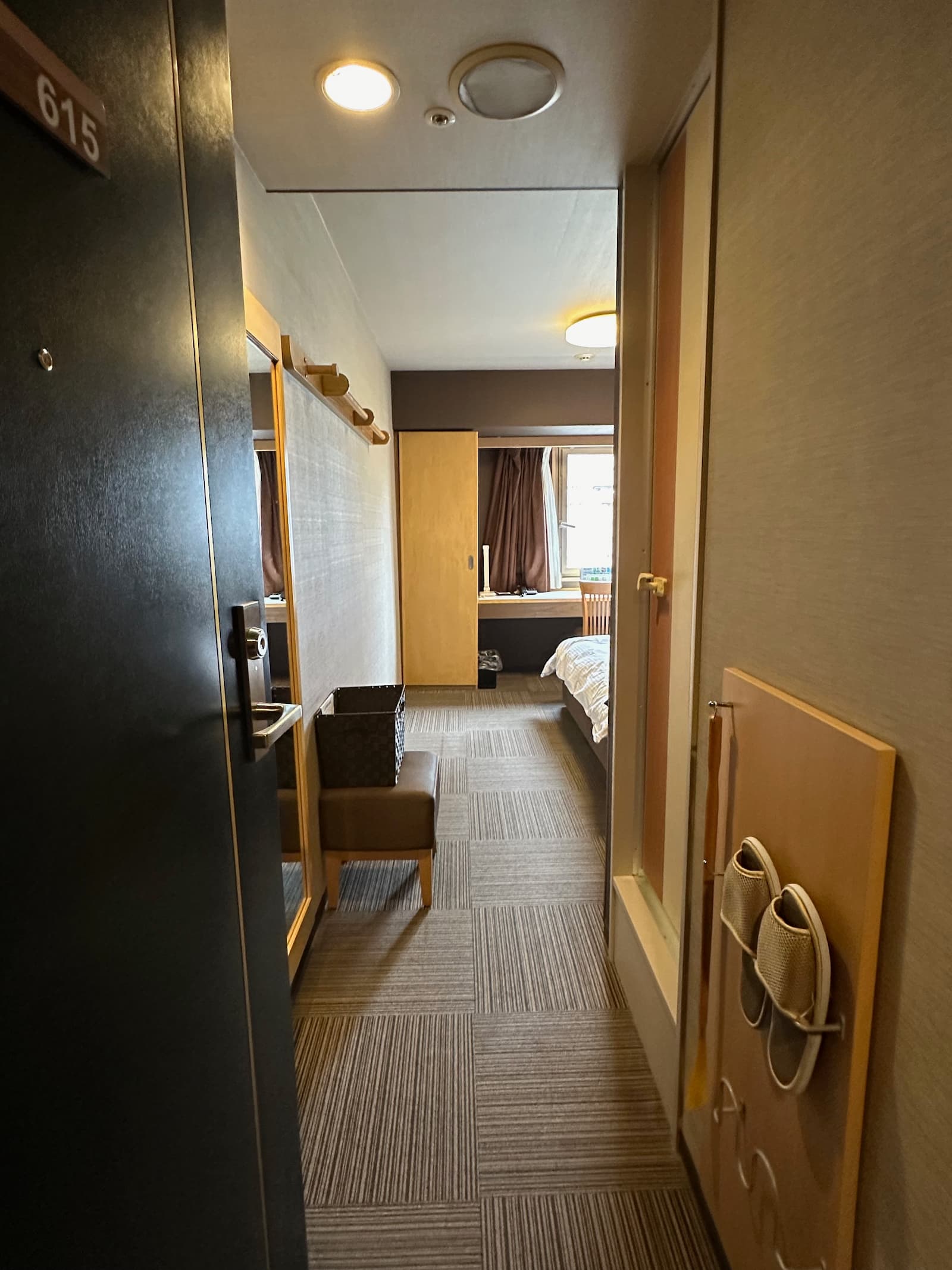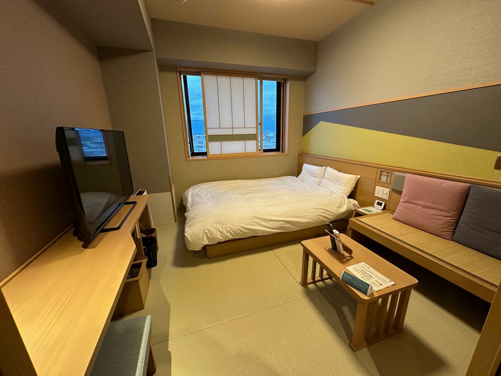 We have room 411, a double room on the fourth floor at the back of the building – nice and quiet. Like most rooms in Japan, it is on the small side but quite okay.