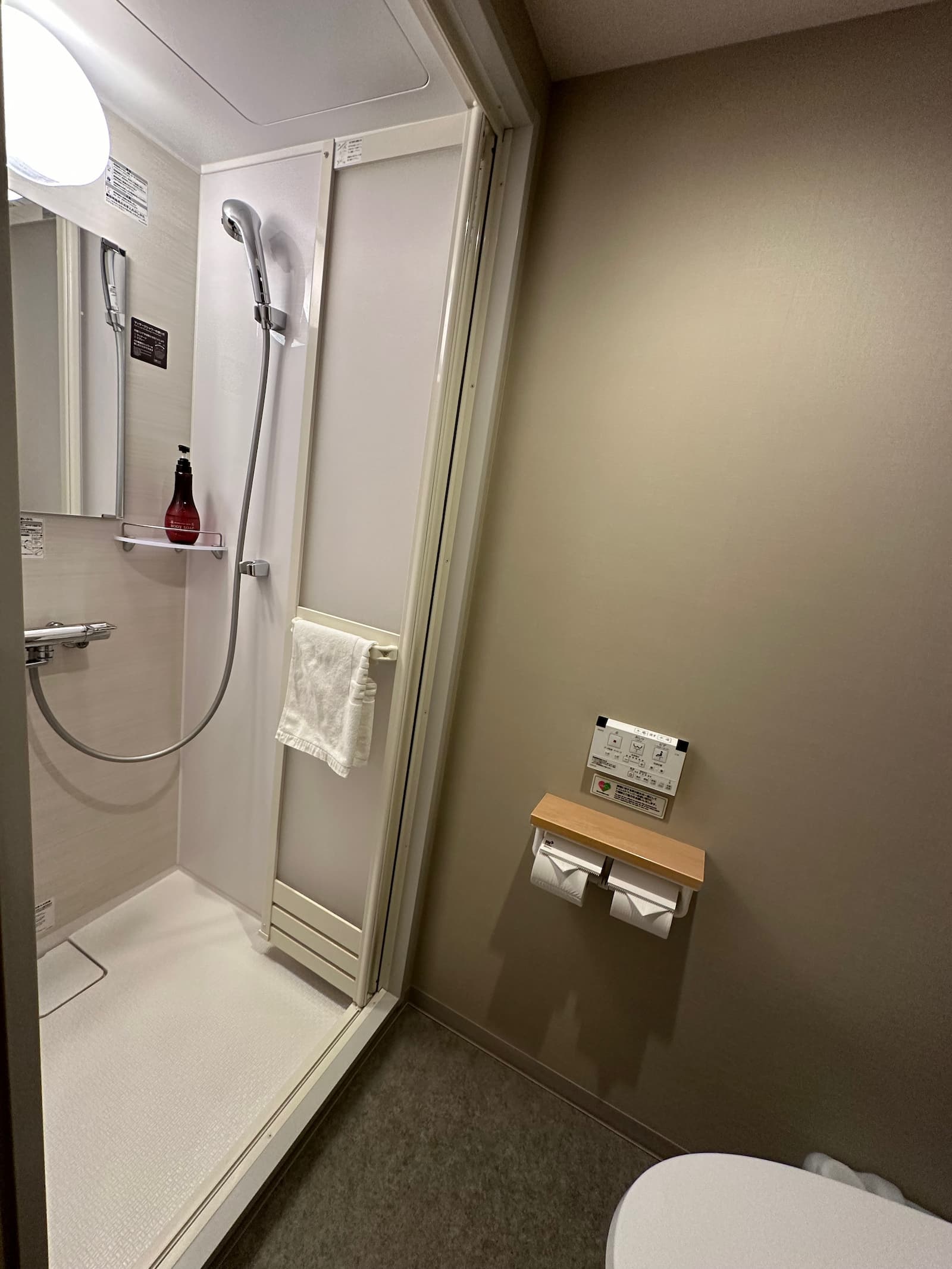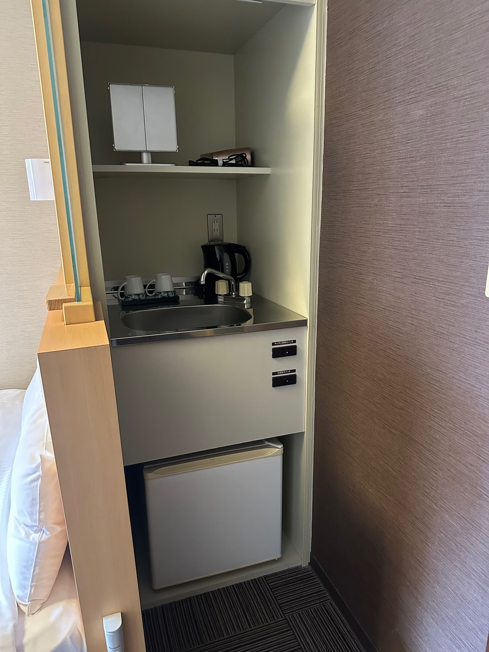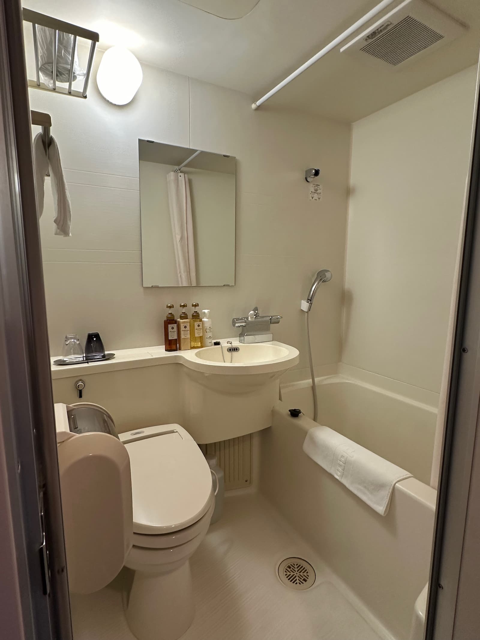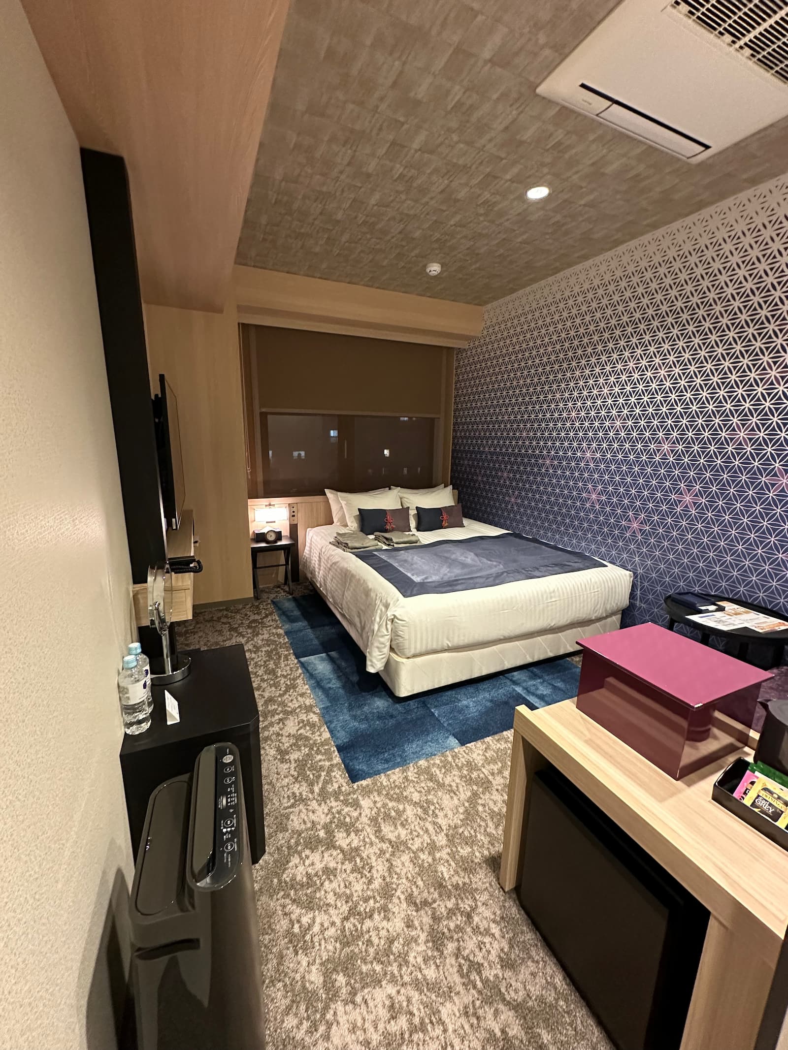 We have room 411, a double room on the fourth floor at the back of the building – nice and quiet. Like most rooms in Japan, it is on the small side but quite okay.