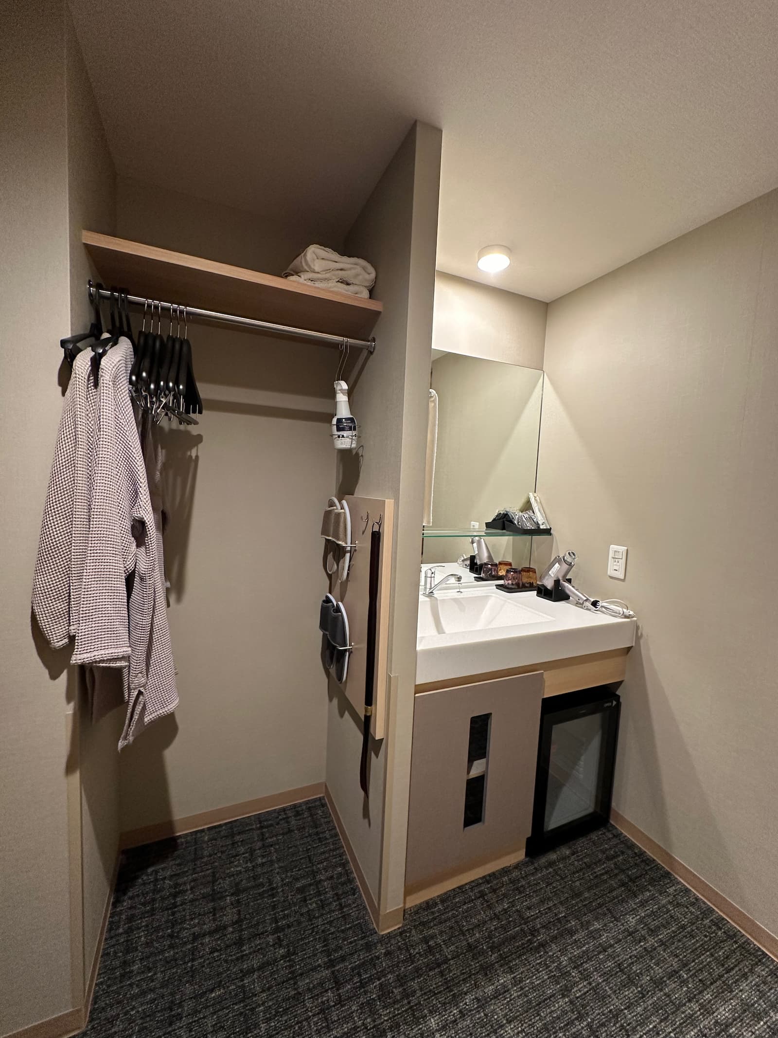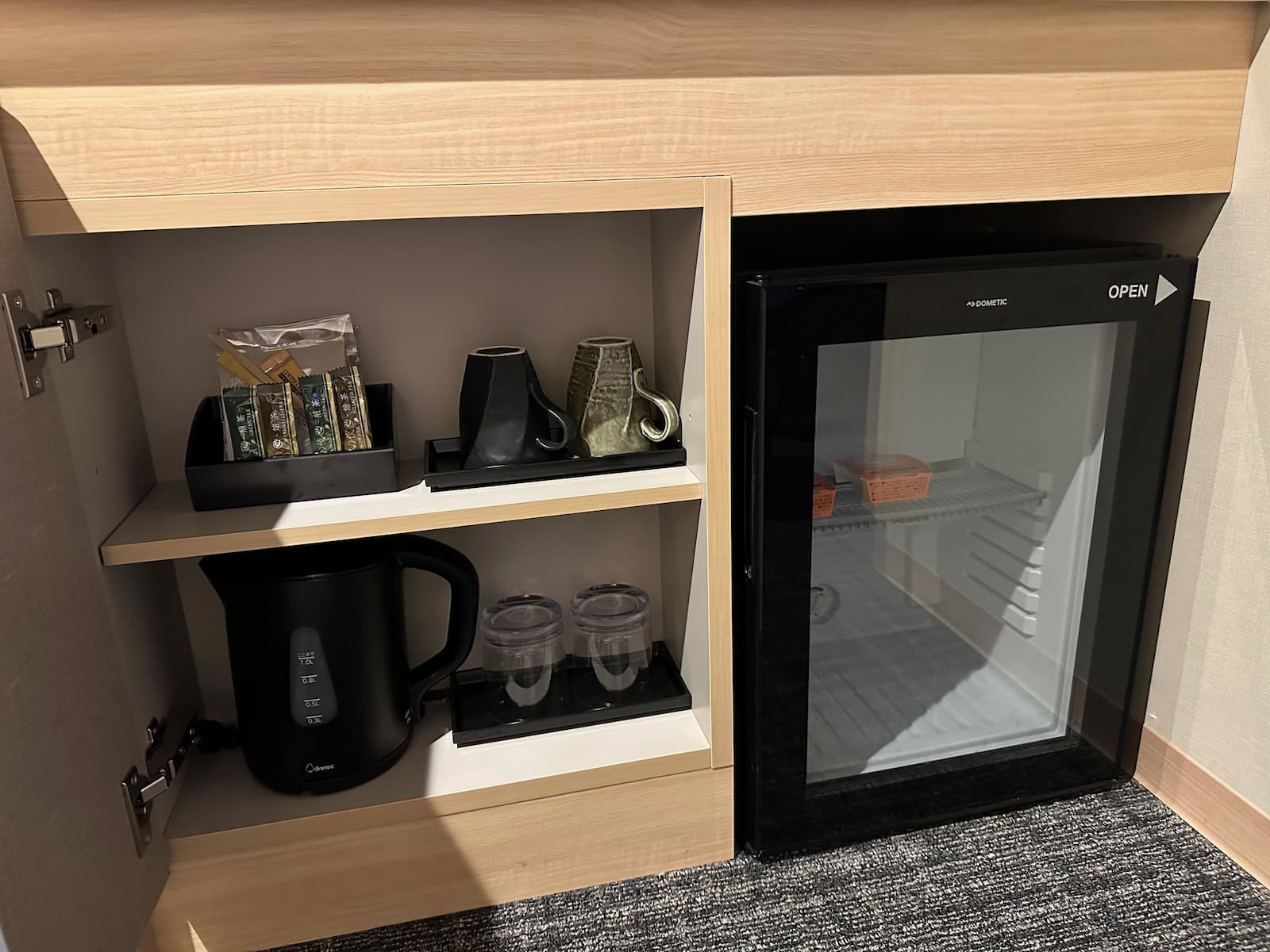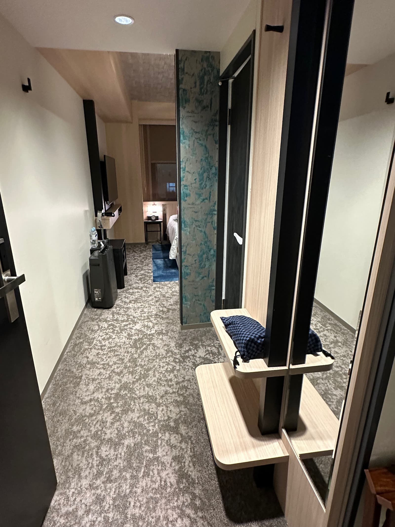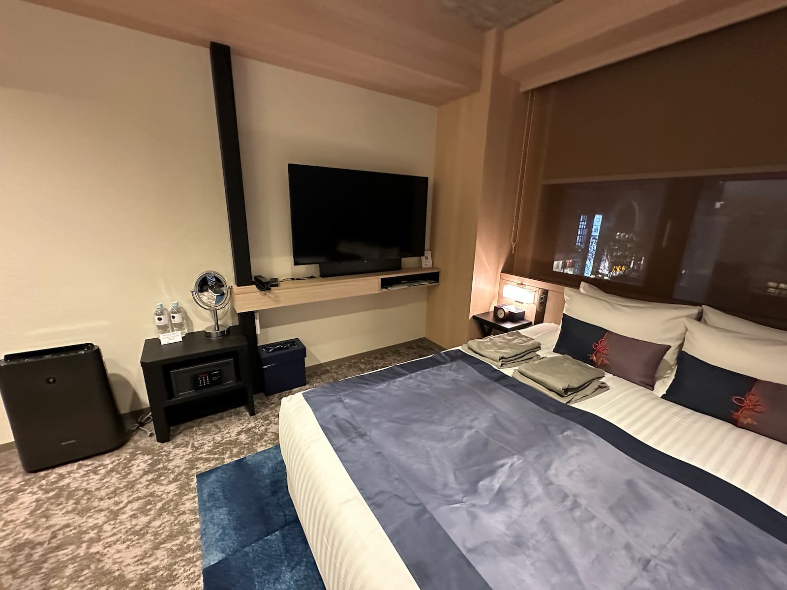 We have room 411, a double room on the fourth floor at the back of the building – nice and quiet. Like most rooms in Japan, it is on the small side but quite okay.