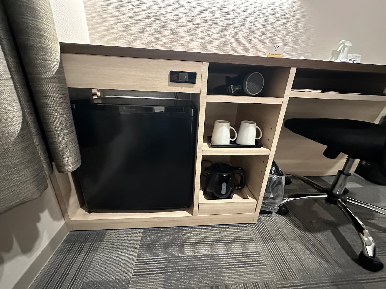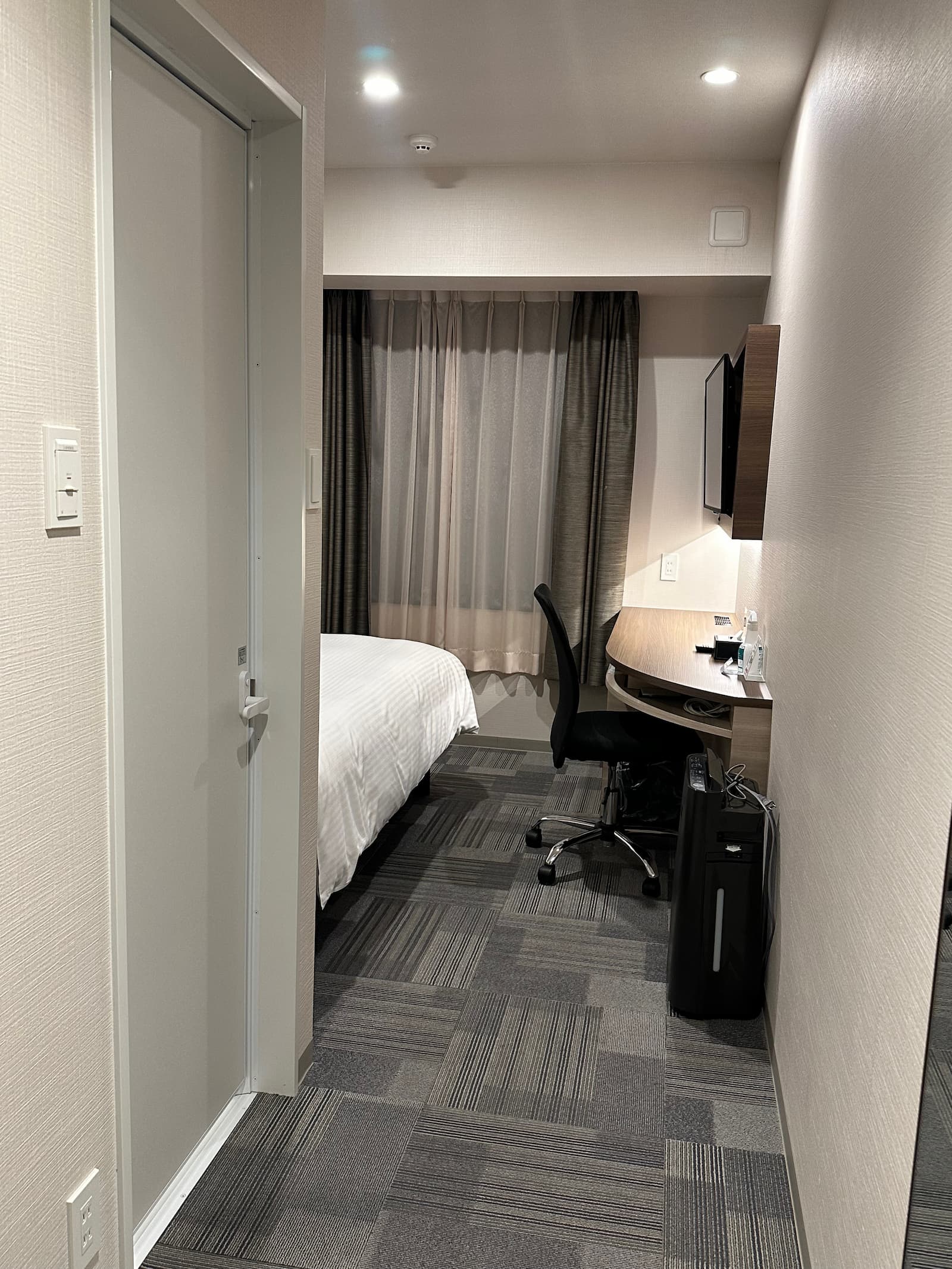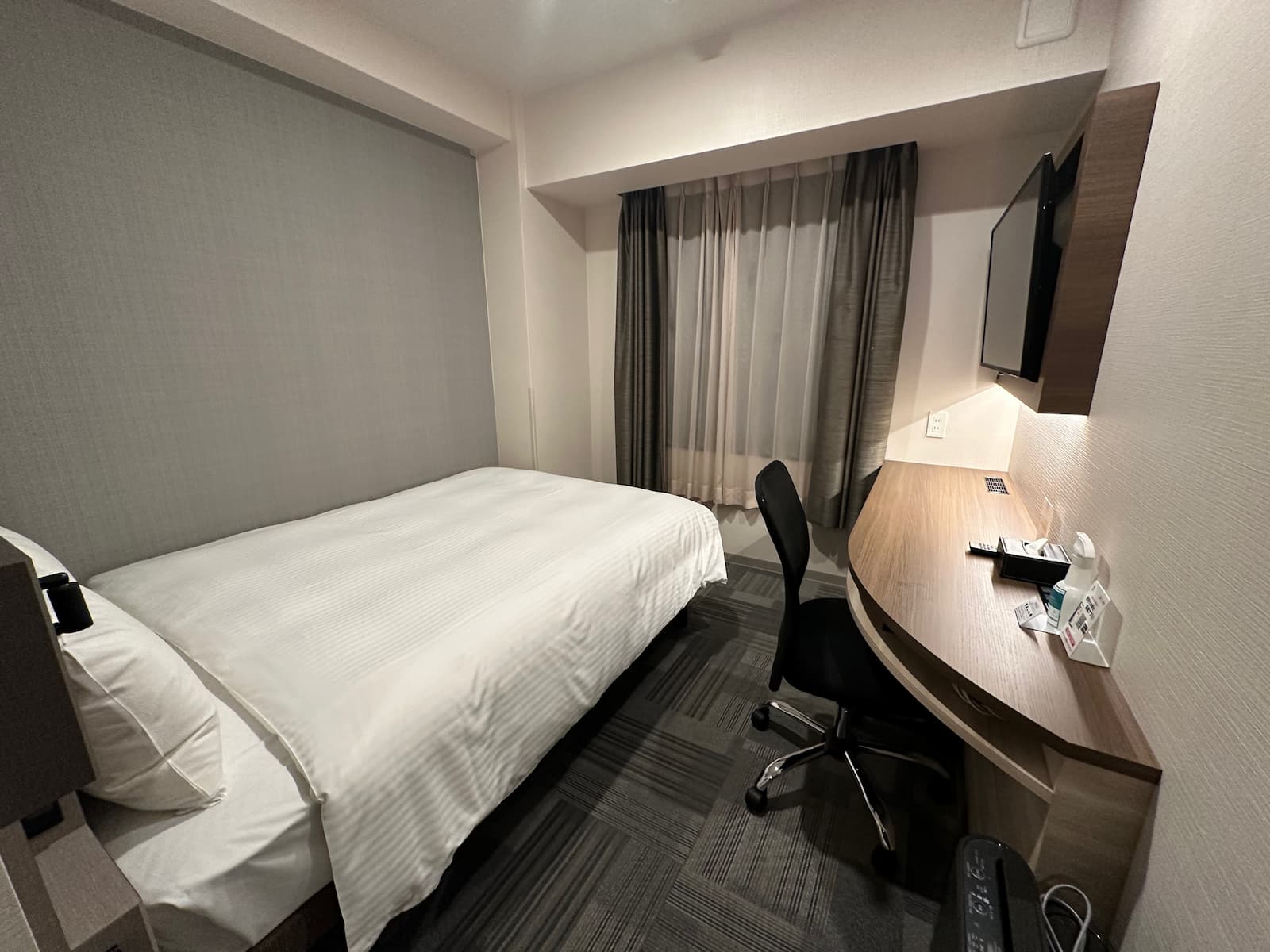 Our room is quite small with a double bed, desk, large TV, small fridge, kettle, hair dryer, hanging space and air conditioning.